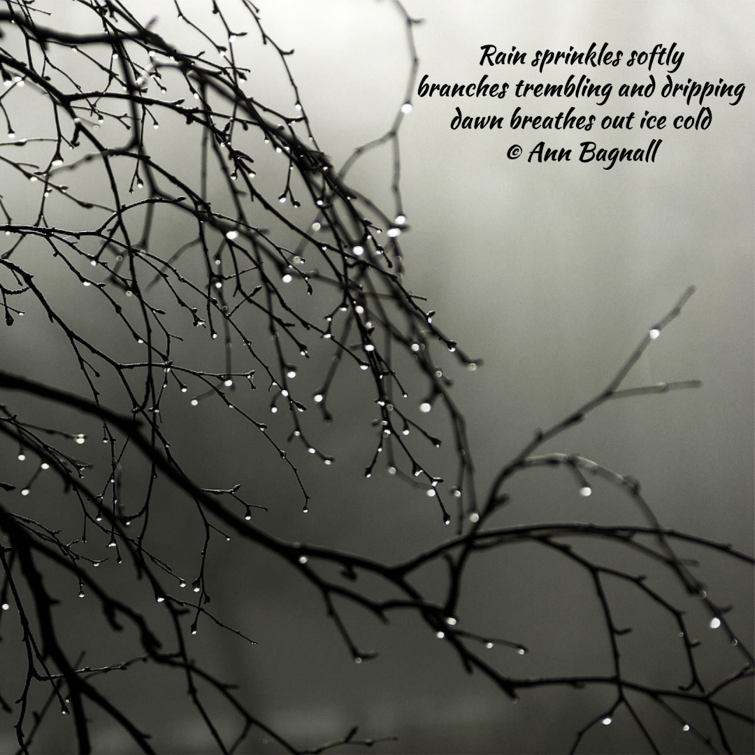 September 20, 2023September 9, 2023 Rain sprinkles softlybranches trembling and drippingdawn breathes out ice cold© Ann Bagnall Share this: Click to email a link to a friend (Opens in new window) Email Tweet Click to print (Opens in new window) Print Like Loading... Related