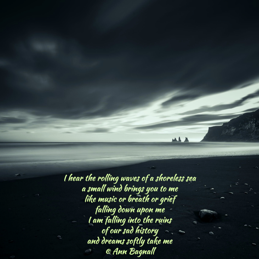 September 26, 2023September 12, 2023 I hear the rolling waves of a shoreless seaa small wind brings you to melike music or breath or grieffalling down upon meI am falling into the ruinsof our sad historyand dreams softly take me © Ann Bagnall Share this: Click to email a link to a friend (Opens in new window) Email Tweet Click to print (Opens in new window) Print Like Loading... Related