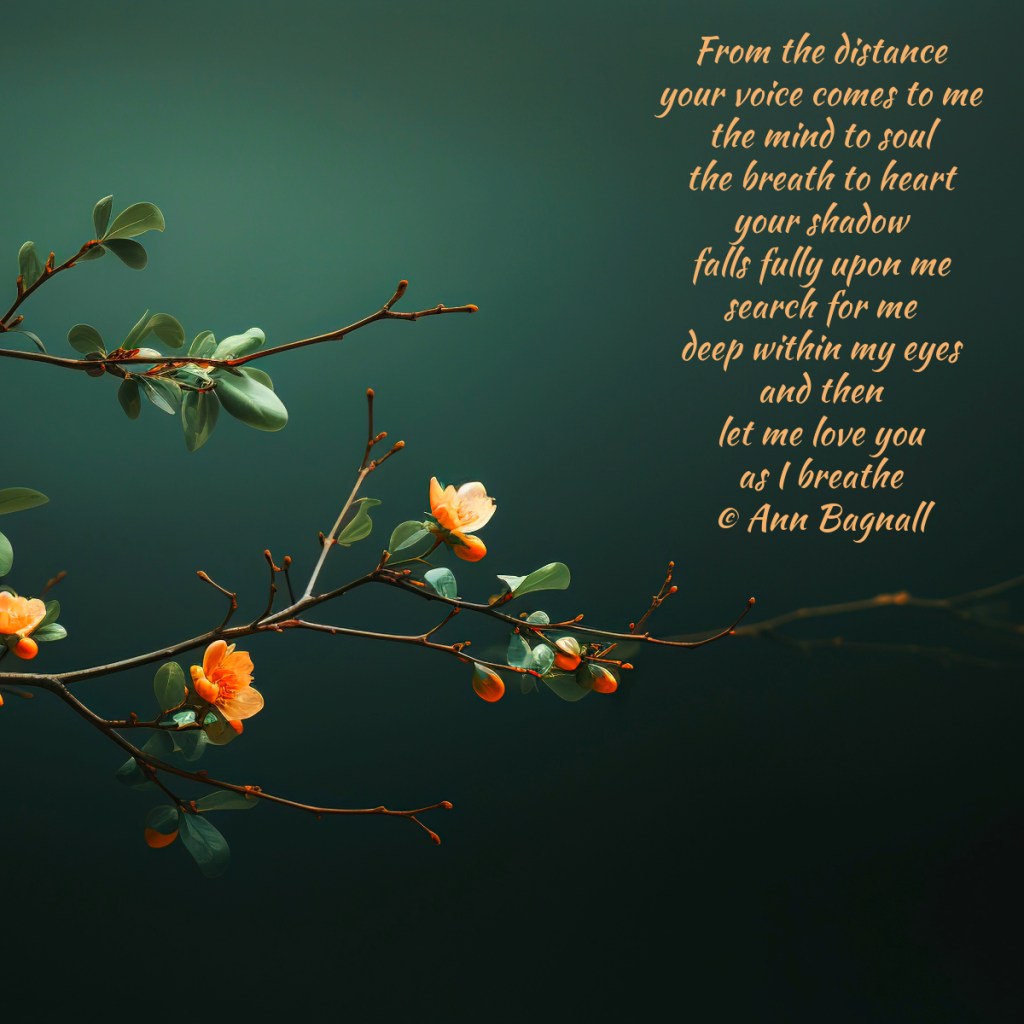 October 3, 2023September 17, 2023 From the distanceyour voice comes to methe mind to soulthe breath to heartyour shadowfalls fully upon mesearch for medeep within my eyesand thenlet me love youas I breathe© Ann Bagnall Share this: Click to email a link to a friend (Opens in new window) Email Tweet Click to print (Opens in new window) Print Like Loading... Related