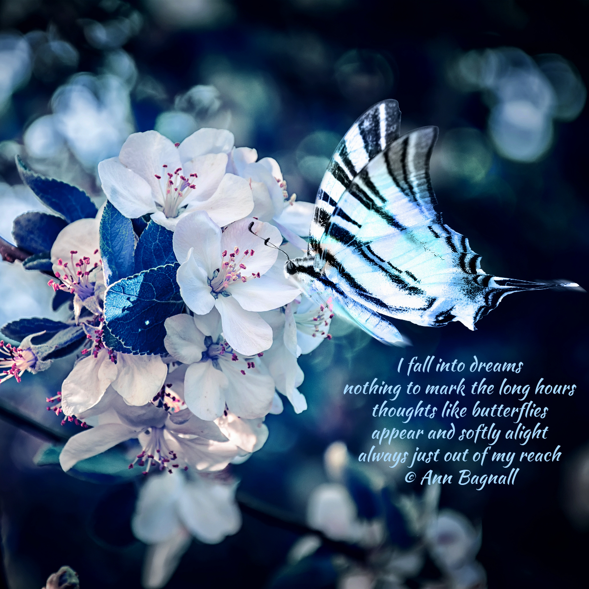 October 6, 2023September 17, 2023 I fall into dreamsnothing to mark the long hoursthoughts like butterfliesappear and softly alightalways just out of my reach© Ann Bagnall Share this: Click to email a link to a friend (Opens in new window) Email Tweet Click to print (Opens in new window) Print Like Loading... Related