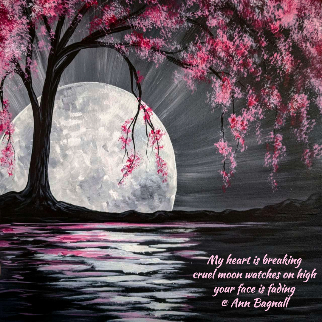 October 9, 2023September 17, 2023 My heart is breakingcruel moon watches on highyour face is fading© Ann Bagnall Share this: Email a link to a friend (Opens in new window) Email Tweet Print (Opens in new window) Print Like Loading... Related