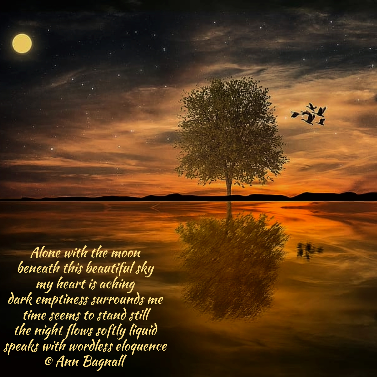 October 11, 2023October 1, 2023 Alone with the moonbeneath this beautiful skymy heart is achingdark emptiness surrounds metime seems to stand stillthe night flows softly liquidspeaks with wordless eloquence© Ann Bagnall Share this: Click to email a link to a friend (Opens in new window) Email Tweet Click to print (Opens in new window) Print Like Loading... Related