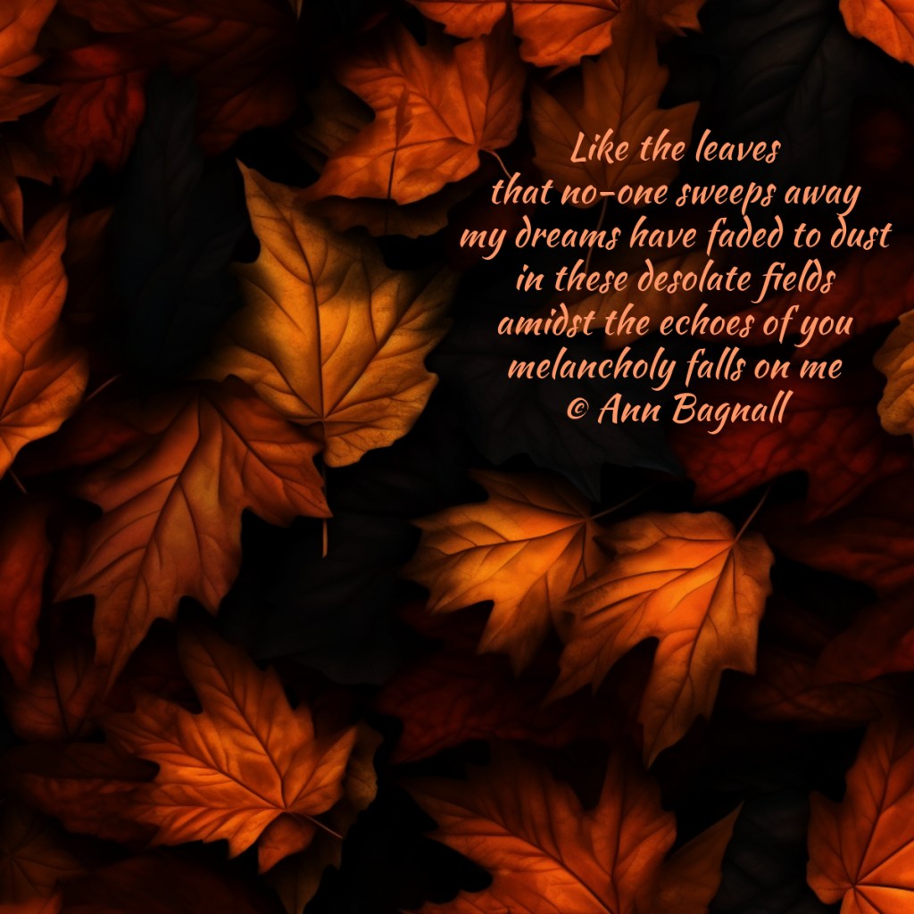 October 18, 2023September 17, 2023 Like the leavesthat no-one sweeps awaymy dreams have faded to dustin these desolate fieldsamidst the echoes of youmelancholy falls on me© Ann Bagnall Share this: Click to email a link to a friend (Opens in new window) Email Tweet Click to print (Opens in new window) Print Like Loading... Related