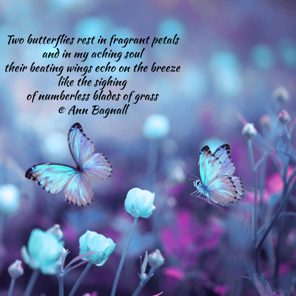 November 1, 2023September 18, 2023 Two butterflies rest in fragrant petalsand in my aching soultheir beating wings echo on the breezelike the sighingof numberless blades of grass© Ann Bagnall Share this: Click to email a link to a friend (Opens in new window) Email Tweet Click to print (Opens in new window) Print Like Loading... Related
