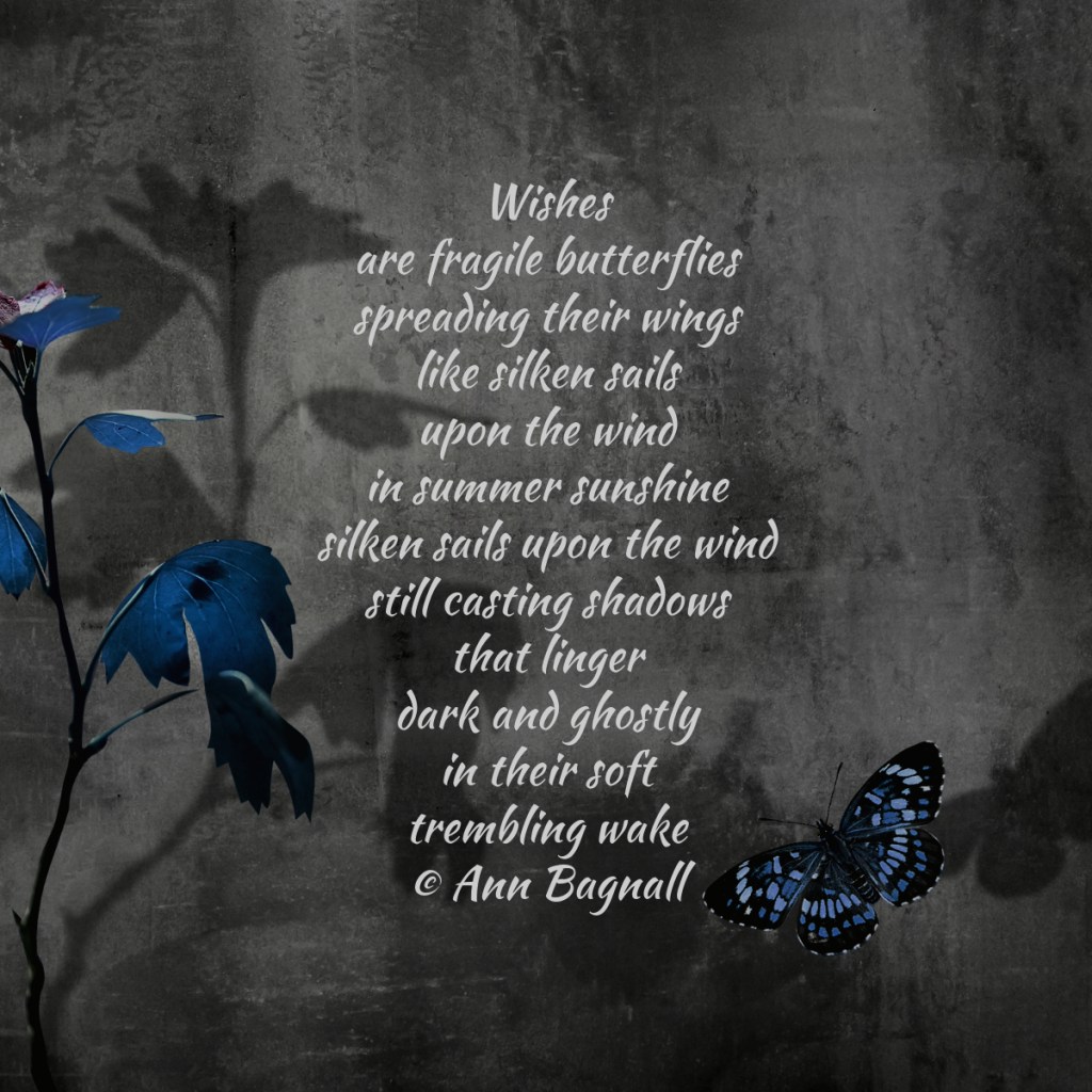 November 7, 2023September 22, 2023 Wishesare fragile butterfliesspreading their wingslike silken sailsupon the windin summer sunshinesilken sails upon the windstill casting shadowsthat lingerdark and ghostlyin their softtrembling wake© Ann Bagnall Share this: Click to email a link to a friend (Opens in new window) Email Tweet Click to print (Opens in new window) Print Like Loading... Related