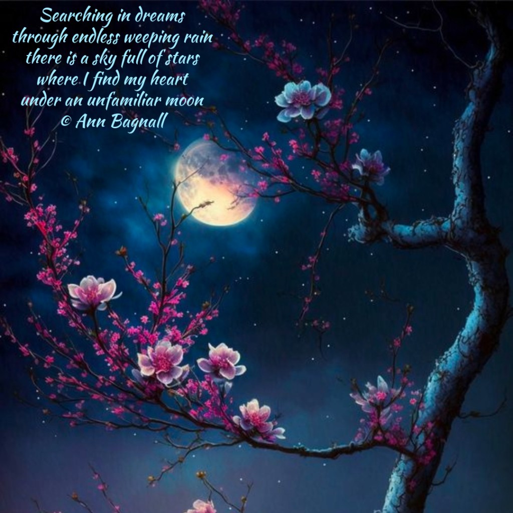 January 14, 2024October 5, 2025 Searching in dreams through endless weeping rain there is a sky full of stars where I find my heart under an unfamiliar moon © Ann Bagnall Share this: Click to email a link to a friend (Opens in new window) Email Tweet Click to print (Opens in new window) Print Like Loading... Related