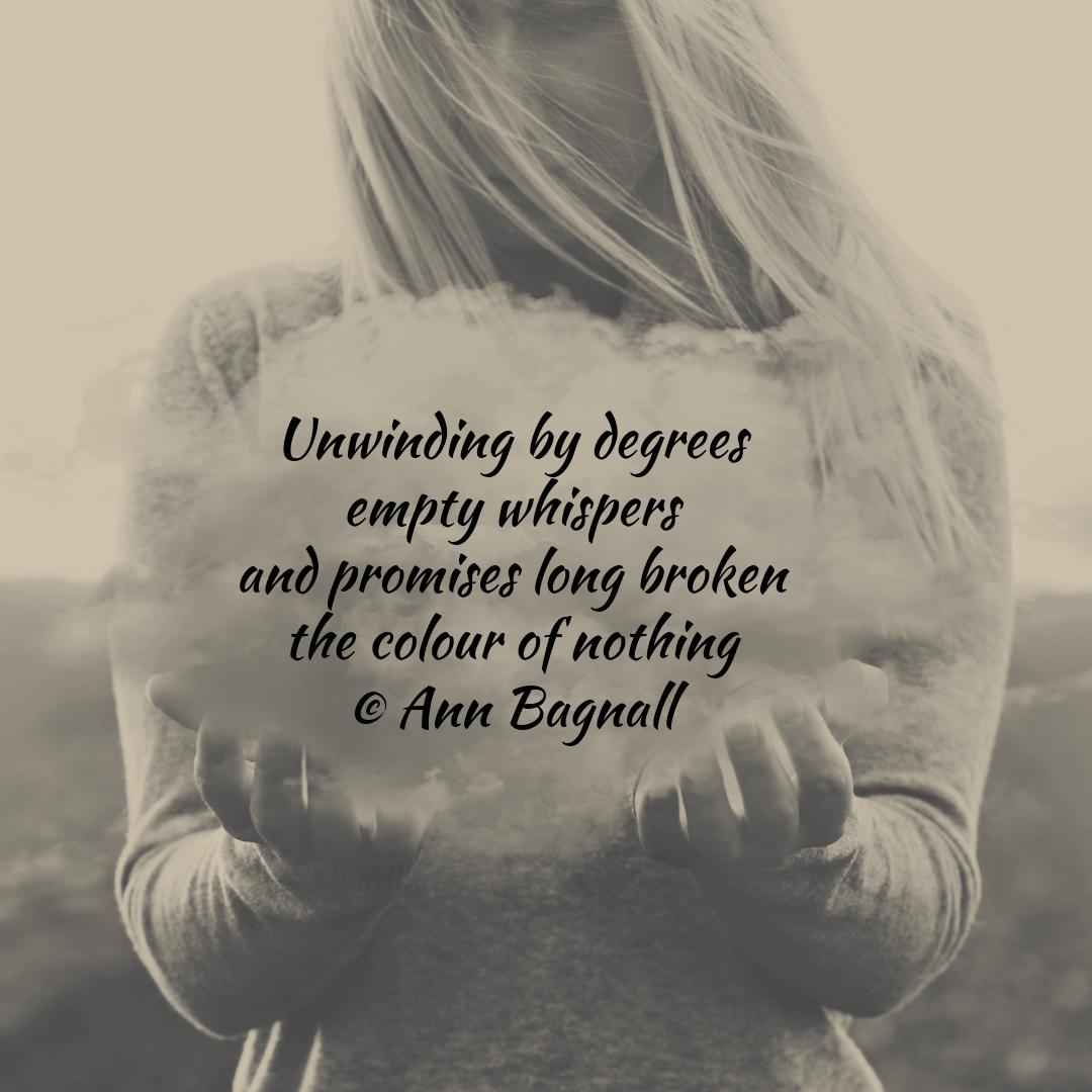 January 15, 2024December 8, 2023 Unwinding by degreesempty whispersand promises long brokenthe colour of nothing© Ann Bagnall Share this: Click to email a link to a friend (Opens in new window) Email Tweet Click to print (Opens in new window) Print Like Loading... Related