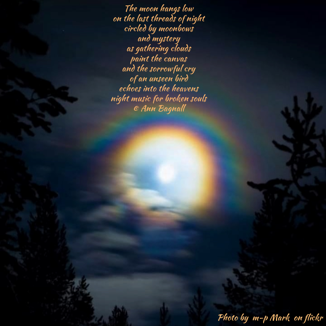 January 27, 2024January 9, 2026 The moon hangs low on the last threads of night circled by moonbows and mystery as gathering clouds paint the canvas and the sorrowful cry of an unseen bird echoes into the heavens night music for broken souls © Ann Bagnall Share this: Click to email a link to a friend (Opens in new window) Email Tweet Click to print (Opens in new window) Print Like Loading... Related
