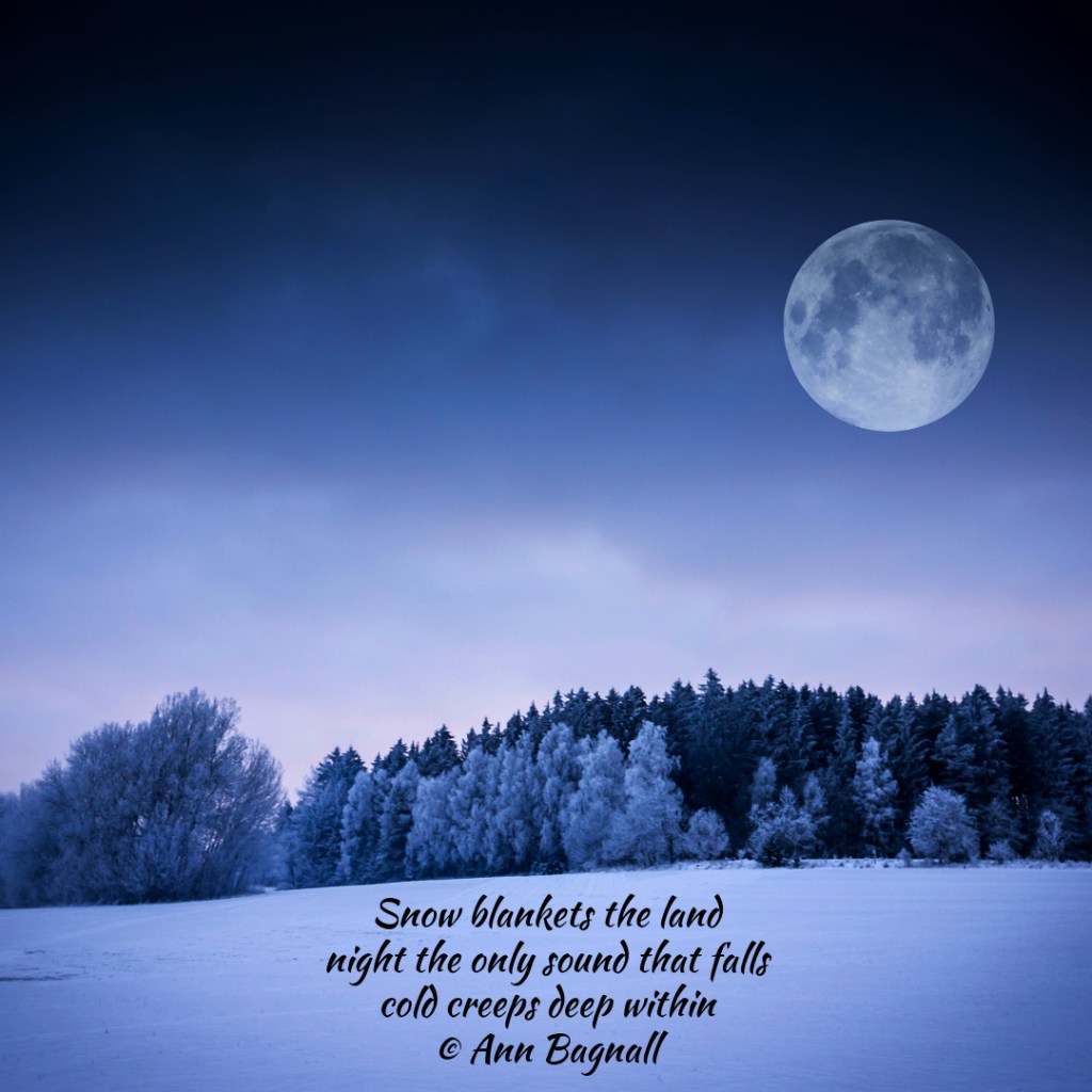 February 16, 2024December 27, 2023 Snow blankets the landnight the only sound that fallscold creeps deep within© Ann Bagnall Share this: Click to email a link to a friend (Opens in new window) Email Tweet Click to print (Opens in new window) Print Like Loading... Related