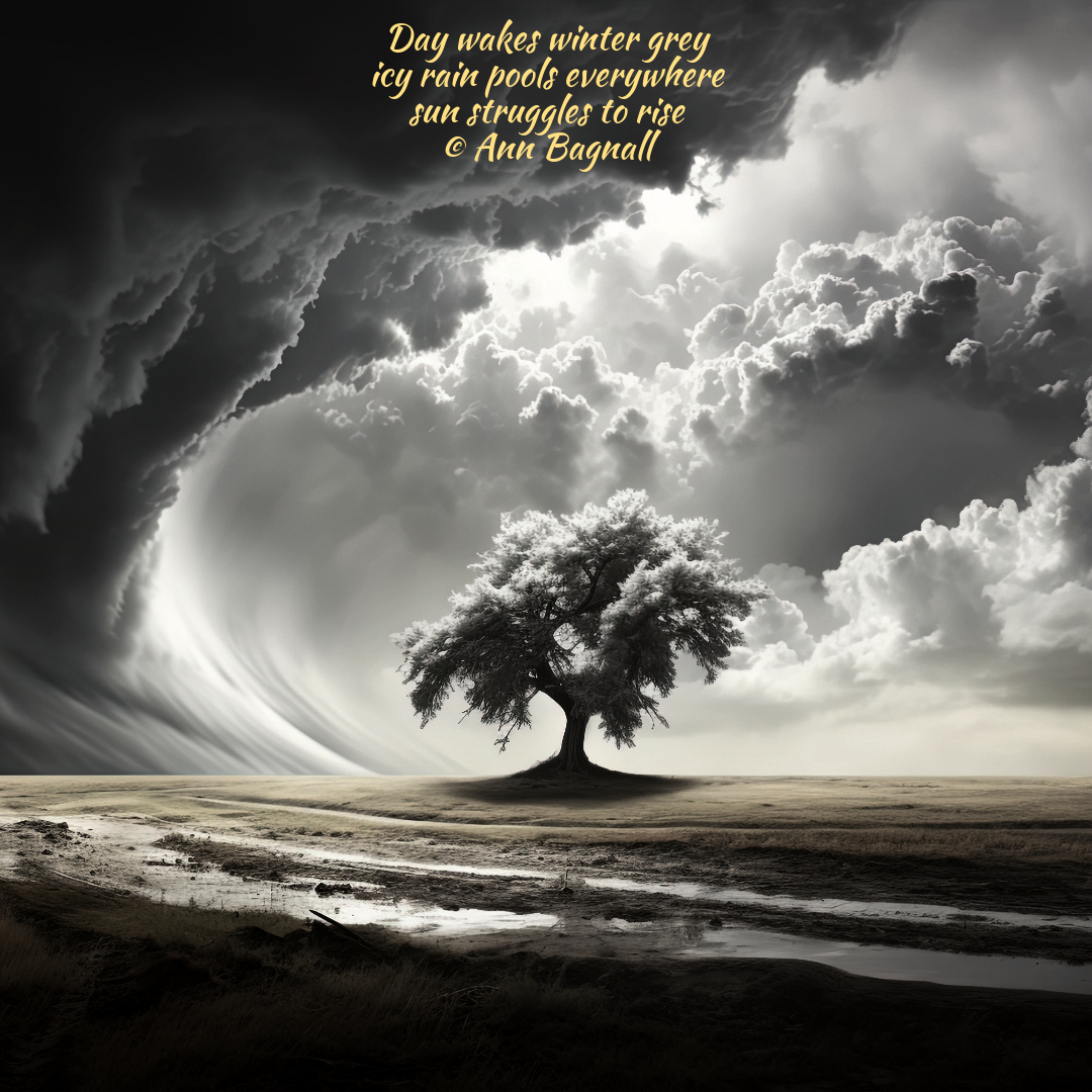 March 4, 2024December 28, 2023 Day wakes winter greyicy rain pools everywheresun struggles to rise© Ann Bagnall Share this: Click to email a link to a friend (Opens in new window) Email Tweet Click to print (Opens in new window) Print Like Loading... Related