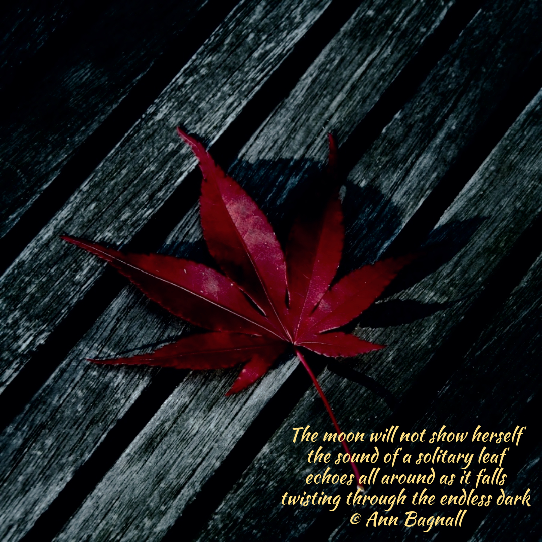March 13, 2024January 6, 2024 The moon will not show herselfthe sound of a solitary leafechoes all around as it fallstwisting through the endless dark© Ann Bagnall Share this: Click to email a link to a friend (Opens in new window) Email Tweet Click to print (Opens in new window) Print Like Loading... Related