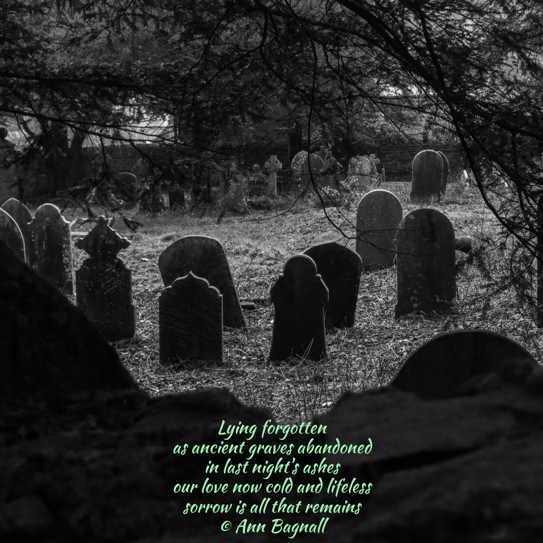 April 5, 2024January 18, 2024 Lying forgottenas ancient graves abandonedin last night’s ashesour love now cold and lifelesssorrow is all that remains© Ann Bagnall Share this: Click to email a link to a friend (Opens in new window) Email Tweet Click to print (Opens in new window) Print Like Loading... Related