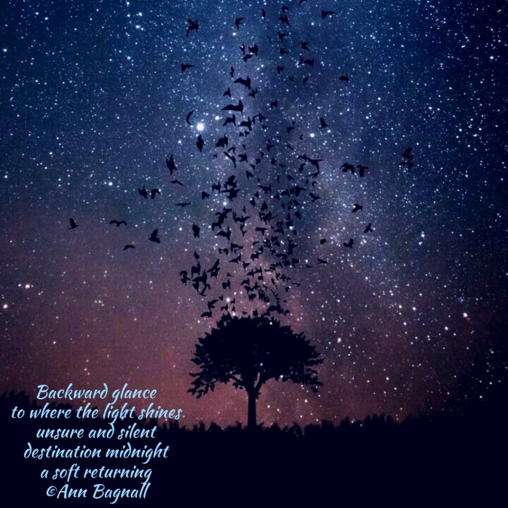 April 7, 2024January 15, 2024 Backward glanceto where the light shinesunsure and silentdestination midnighta soft returning©Ann Bagnall Share this: Email a link to a friend (Opens in new window) Email Tweet Print (Opens in new window) Print Like Loading... Related