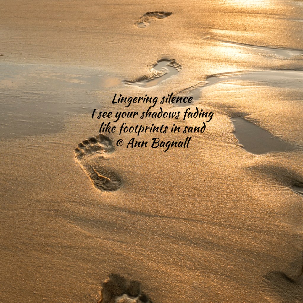 April 8, 2024January 15, 2024 Lingering silenceI see your shadows fadinglike footprints in sand© Ann Bagnall Share this: Click to email a link to a friend (Opens in new window) Email Tweet Click to print (Opens in new window) Print Like Loading... Related