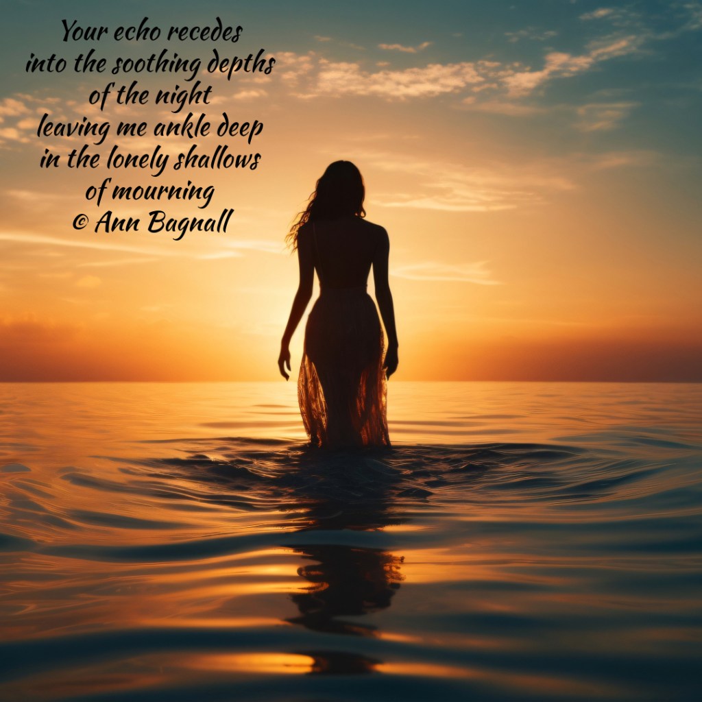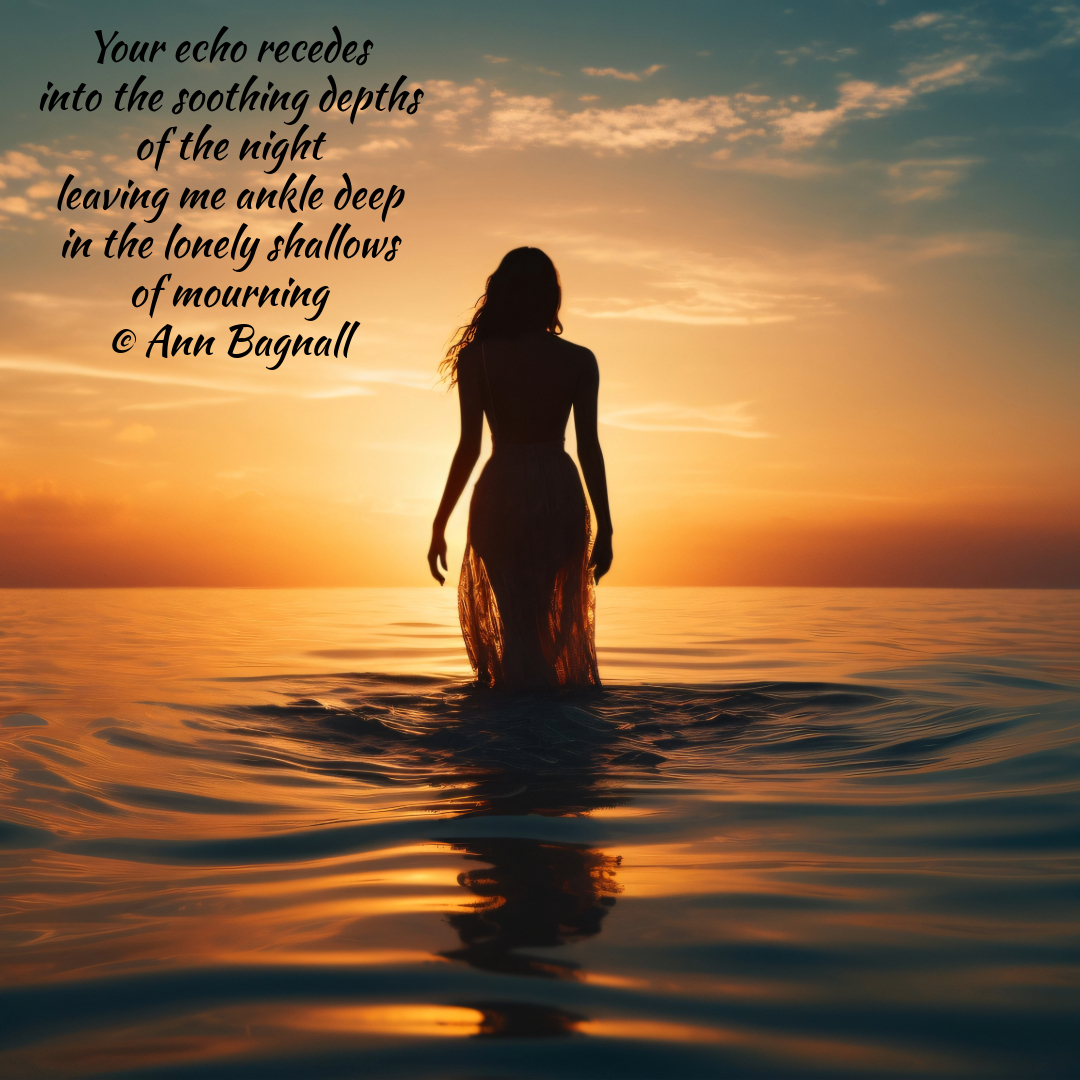 April 15, 2024January 21, 2024 Your echo recedesinto the soothing depthsof the nightleaving me ankle deepin the lonely shallowsof mourning© Ann Bagnall Share this: Click to email a link to a friend (Opens in new window) Email Tweet Click to print (Opens in new window) Print Like Loading... Related