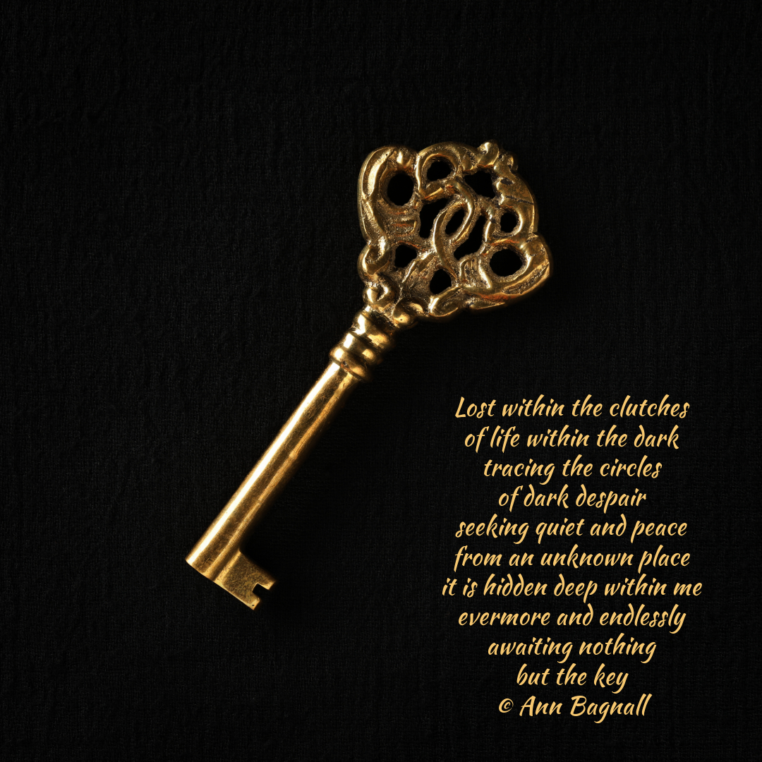 April 18, 2024January 21, 2024 Lost within the clutchesof life within the darktracing the circlesof dark despairseeking quiet and peacefrom an unknown placeit is hidden deep within meevermore and endlesslyawaiting nothingbut the key© Ann Bagnall Share this: Click to email a link to a friend (Opens in new window) Email Tweet Click to print (Opens in new window) Print Like Loading... Related