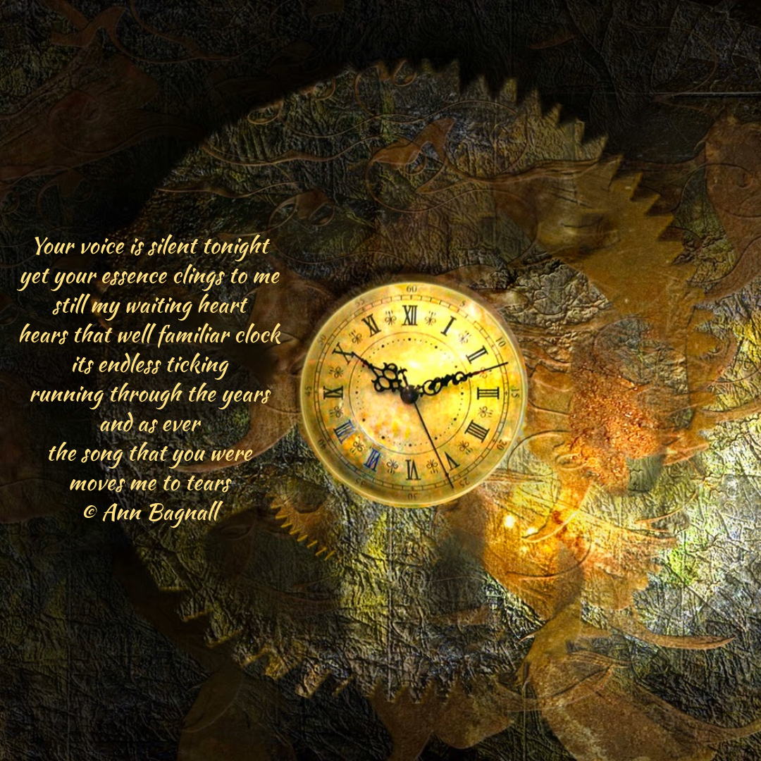 April 21, 2024January 11, 2024 Your voice is silent tonightyet your essence clings to mestill my waiting hearthears that well familiar clockits endless tickingrunning through the yearsand as everthe song that you weremoves me to tears© Ann Bagnall Share this: Click to email a link to a friend (Opens in new window) Email Tweet Click to print (Opens in new window) Print Like Loading... Related