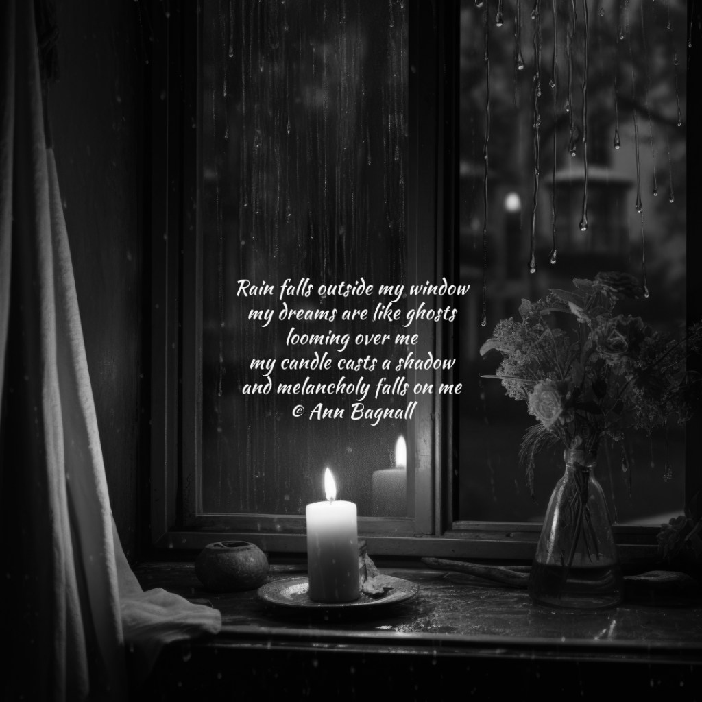 April 22, 2024January 28, 2024 Rain falls outside my windowand my dreams are like ghostslooming over memy candle casts a shadowand melancholy falls on me© Ann Bagnall Share this: Click to email a link to a friend (Opens in new window) Email Tweet Click to print (Opens in new window) Print Like Loading... Related