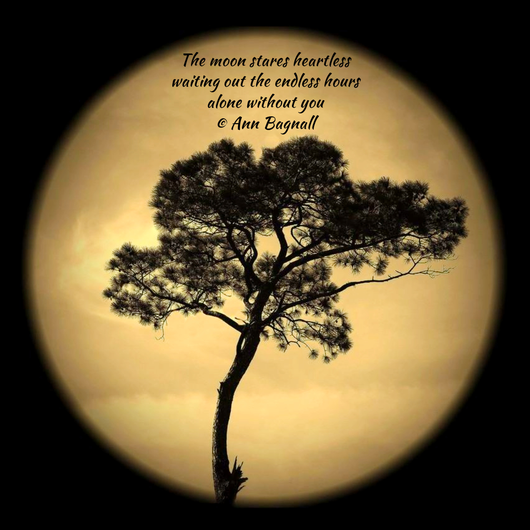 April 30, 2024January 10, 2026 The moon stares heartlesswaiting out the endless hoursalone without you© Ann Bagnall Share this: Click to email a link to a friend (Opens in new window) Email Tweet Click to print (Opens in new window) Print Like Loading... Related