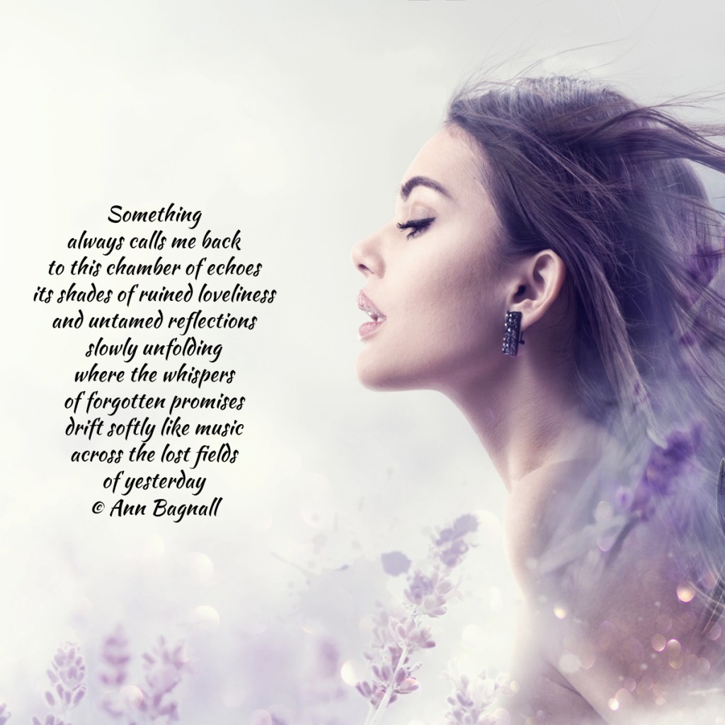 May 2, 2024December 24, 2025 Something always calls me backto this chamber of echoesits shades of ruined lovelinessand untamed reflectionsslowly unfoldingwhere the whispersof forgotten promisesdrift softly like musicacross the lost fields of yesterday© Ann Bagnall Share this: Click to email a link to a friend (Opens in new window) Email Tweet Click to print (Opens in new window) Print Like Loading... Related