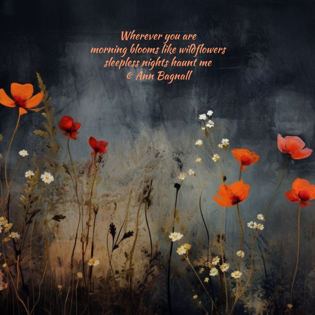 May 28, 2024February 22, 2024 Wherever you aremorning blooms like wildflowerssleepless nights haunt me© Ann Bagnall Share this: Click to email a link to a friend (Opens in new window) Email Tweet Click to print (Opens in new window) Print Like Loading... Related