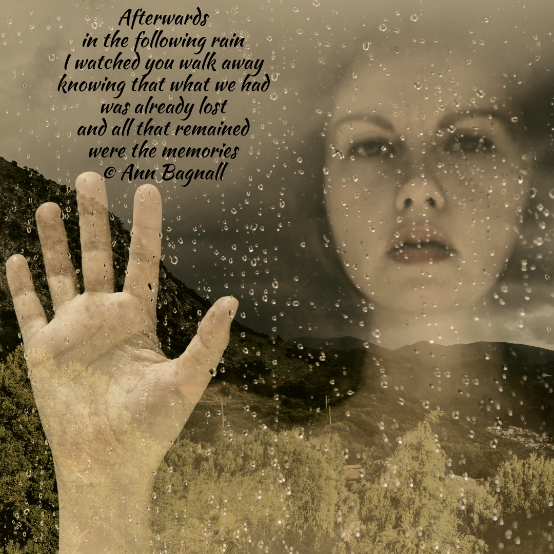 June 4, 2024April 26, 2024 Afterwardsin the following rainI watched you walk awayknowing that what we hadwas already lostand all that remainedwere the memories© Ann Bagnall Share this: Click to email a link to a friend (Opens in new window) Email Tweet Click to print (Opens in new window) Print Like Loading... Related