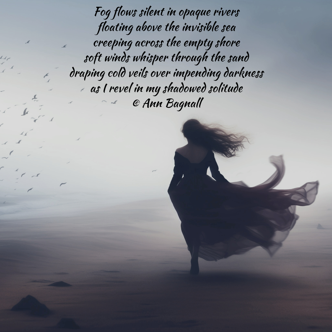 June 9, 2024March 25, 2024 Fog flows silent in opaque riversfloating above the invisible seacreeping across the empty shoresoft winds whisper through the sanddraping cold veils over impending darknessas I revel in my shadowed solitude© Ann Bagnall Share this: Click to email a link to a friend (Opens in new window) Email Tweet Click to print (Opens in new window) Print Like Loading... Related