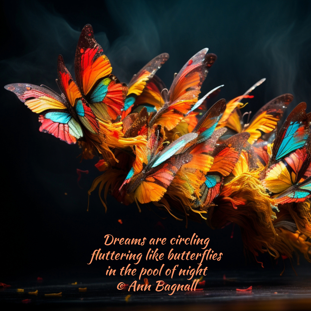 June 12, 2024March 25, 2024 Dreams are circlingfluttering like butterfliesin the pool of night© Ann Bagnall Share this: Click to email a link to a friend (Opens in new window) Email Tweet Click to print (Opens in new window) Print Like Loading... Related