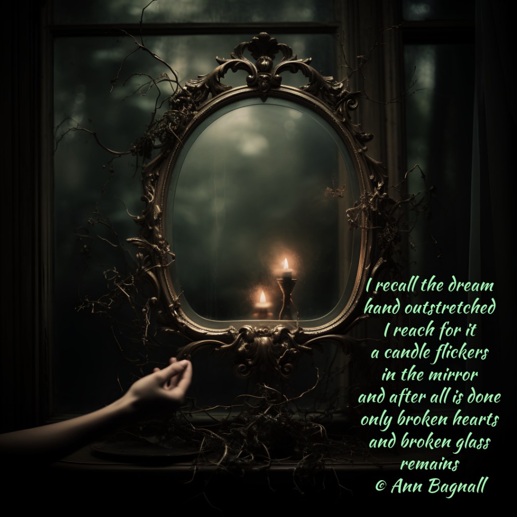 June 18, 2024April 28, 2024 I recall the dreamhand outstretched I reach for ita candle flickers in the mirrorand after all is doneonly broken heartsand broken glass remains© Ann Bagnall Share this: Click to email a link to a friend (Opens in new window) Email Tweet Click to print (Opens in new window) Print Like Loading... Related