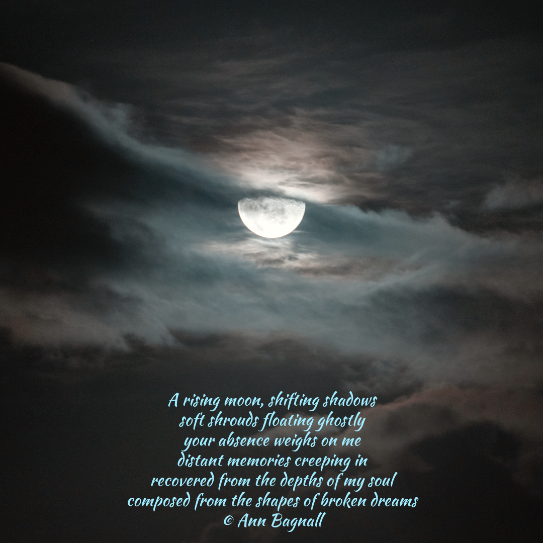 June 23, 2024April 28, 2024 A rising moon, shifting shadowssoft shrouds floating ghostlyyour absence weighs on medistant memories creeping inrecovered from the depths of my soulcomposed from the shapes of broken dreams© Ann Bagnall Share this: Email a link to a friend (Opens in new window) Email Tweet Print (Opens in new window) Print Like Loading... Related
