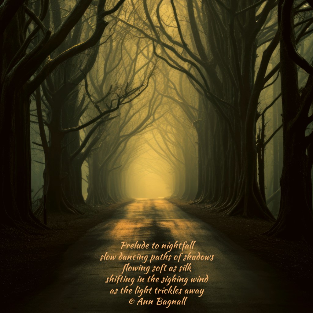 June 26, 2024January 4, 2025 Prelude to nightfall slow dancing paths of shadows flowing soft as silk shifting in the sighing wind as the light trickles away © Ann Bagnall Share this: Click to email a link to a friend (Opens in new window) Email Tweet Click to print (Opens in new window) Print Like Loading... Related