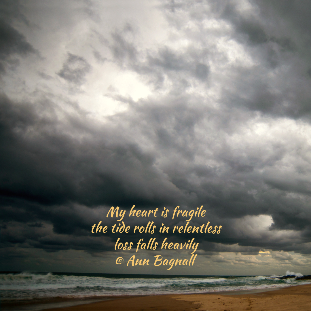 July 10, 2024January 4, 2025 My heart is fragile the tide rolls in relentless loss falls heavily © Ann Bagnall Share this: Email a link to a friend (Opens in new window) Email Tweet Print (Opens in new window) Print Like Loading... Related