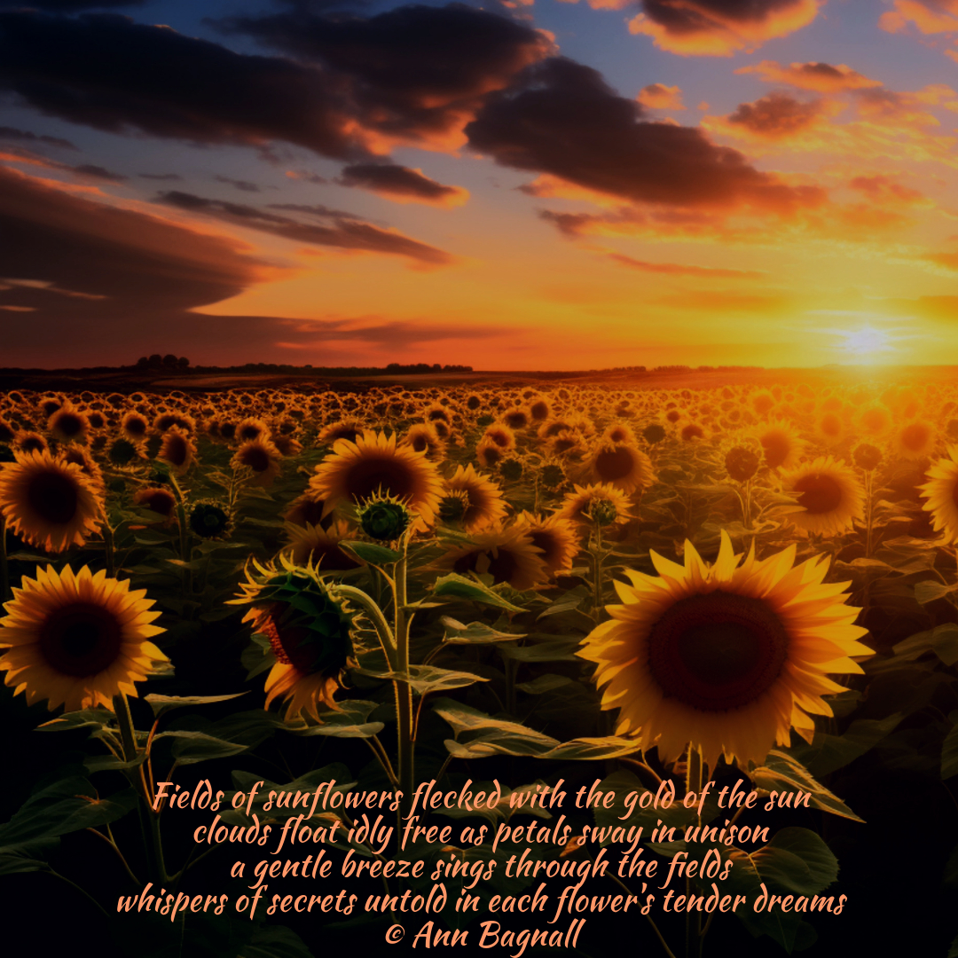 July 14, 2024December 30, 2024 Fields of sunflowers flecked with the gold of the sun clouds float idly free as petals sway in unison a gentle breeze sings through the fields whispers of secrets untold in each flower’s tender dreams © Ann Bagnall Share this: Click to email a link to a friend (Opens in new window) Email Tweet Click to print (Opens in new window) Print Like Loading... Related