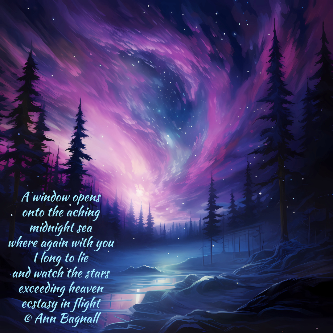 July 15, 2024December 30, 2024 A window opens onto the aching midnight sea where again with you I long to lie and watch the stars exceeding heaven ecstasy in flight © Ann Bagnall Share this: Email a link to a friend (Opens in new window) Email Tweet Print (Opens in new window) Print Like Loading... Related