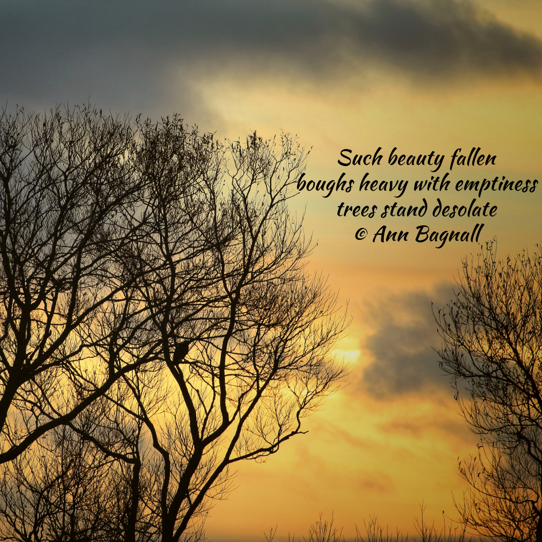 July 25, 2024December 22, 2024 Such beauty fallen boughs heavy with emptiness trees stand desolate © Ann Bagnall Share this: Click to email a link to a friend (Opens in new window) Email Tweet Click to print (Opens in new window) Print Like Loading... Related