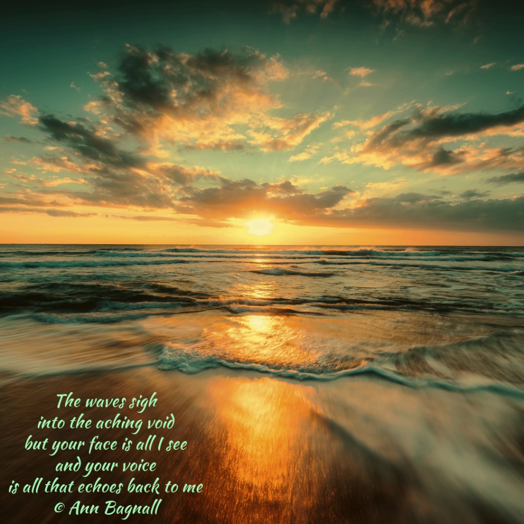 July 26, 2024December 22, 2024 The waves sigh into the aching void but your face is all I see and your voice is all that echoes back to me © Ann Bagnall Share this: Click to email a link to a friend (Opens in new window) Email Tweet Click to print (Opens in new window) Print Like Loading... Related