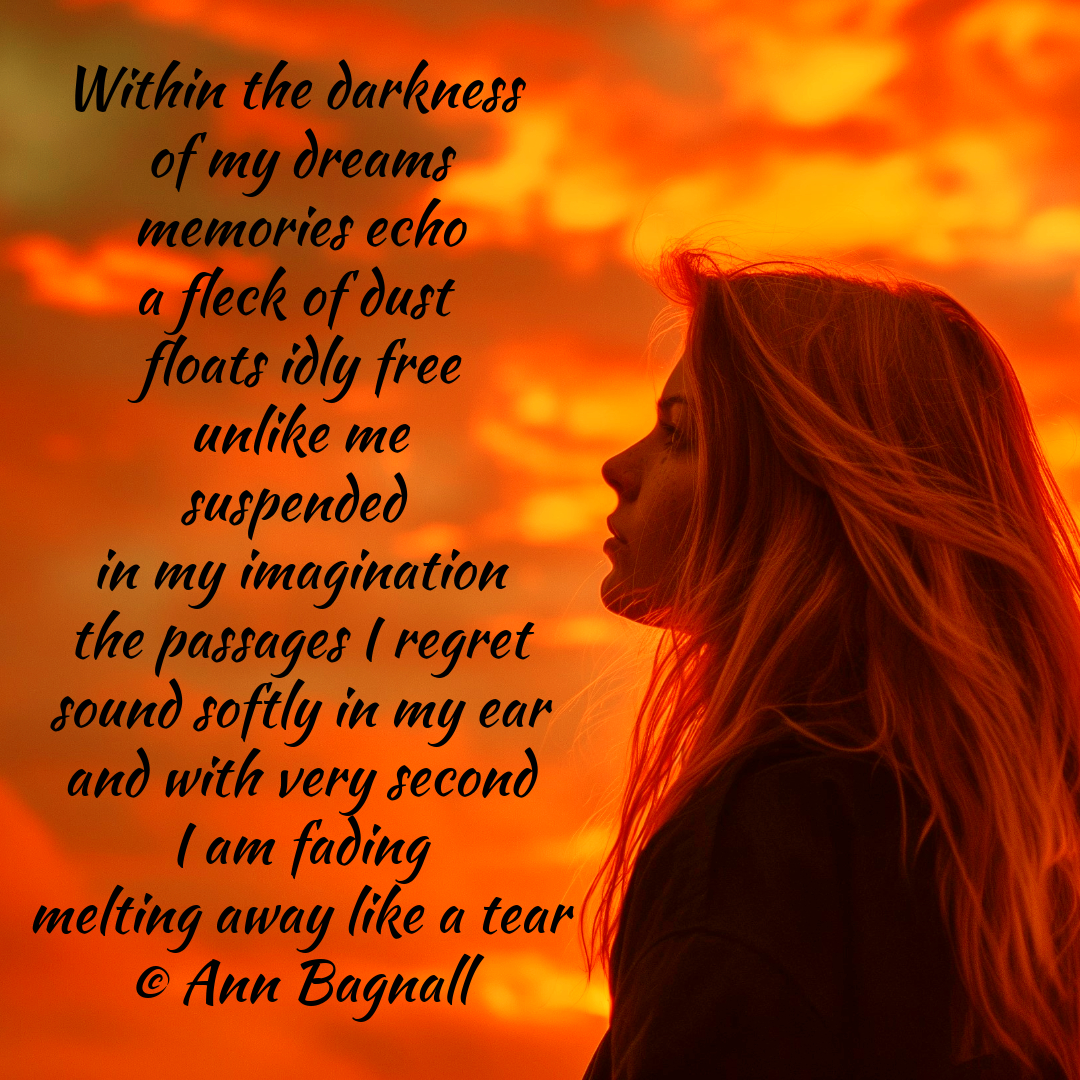 July 30, 2024January 4, 2026 Within the darkness of my dreams memories echo a fleck of dust floats idly free unlike me suspended in my imagination the passages I regret sound softly in my ear and with very second I am fading melting away like a tear © Ann Bagnall Share this: Click to email a link to a friend (Opens in new window) Email Tweet Click to print (Opens in new window) Print Like Loading... Related