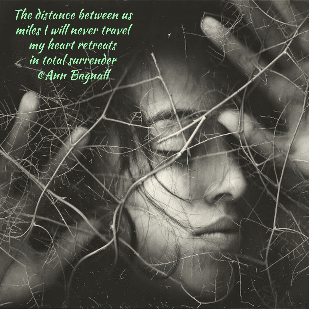 August 1, 2024December 22, 2024 The distance between us miles I will never travel my heart retreats in total surrender ©Ann Bagnall Share this: Click to email a link to a friend (Opens in new window) Email Tweet Click to print (Opens in new window) Print Like Loading... Related