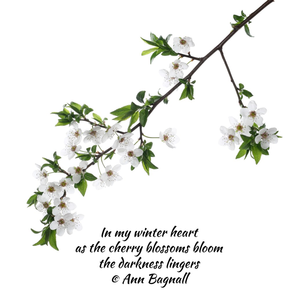 August 20, 2024December 21, 2024 In my winter heart as the cherry blossoms bloom the darkness lingers © Ann Bagnall Share this: Email a link to a friend (Opens in new window) Email Tweet Print (Opens in new window) Print Like Loading... Related
