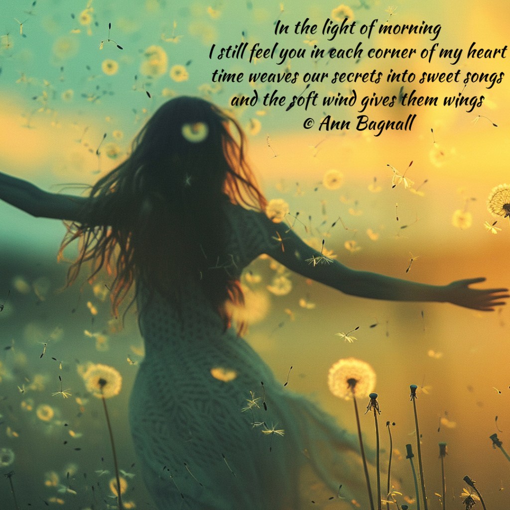 August 21, 2024December 21, 2024 In the light of morning I still feel you in each corner of my heart time weaves our secrets into sweet songs and the soft wind gives them wings © Ann Bagnall Share this: Click to email a link to a friend (Opens in new window) Email Tweet Click to print (Opens in new window) Print Like Loading... Related