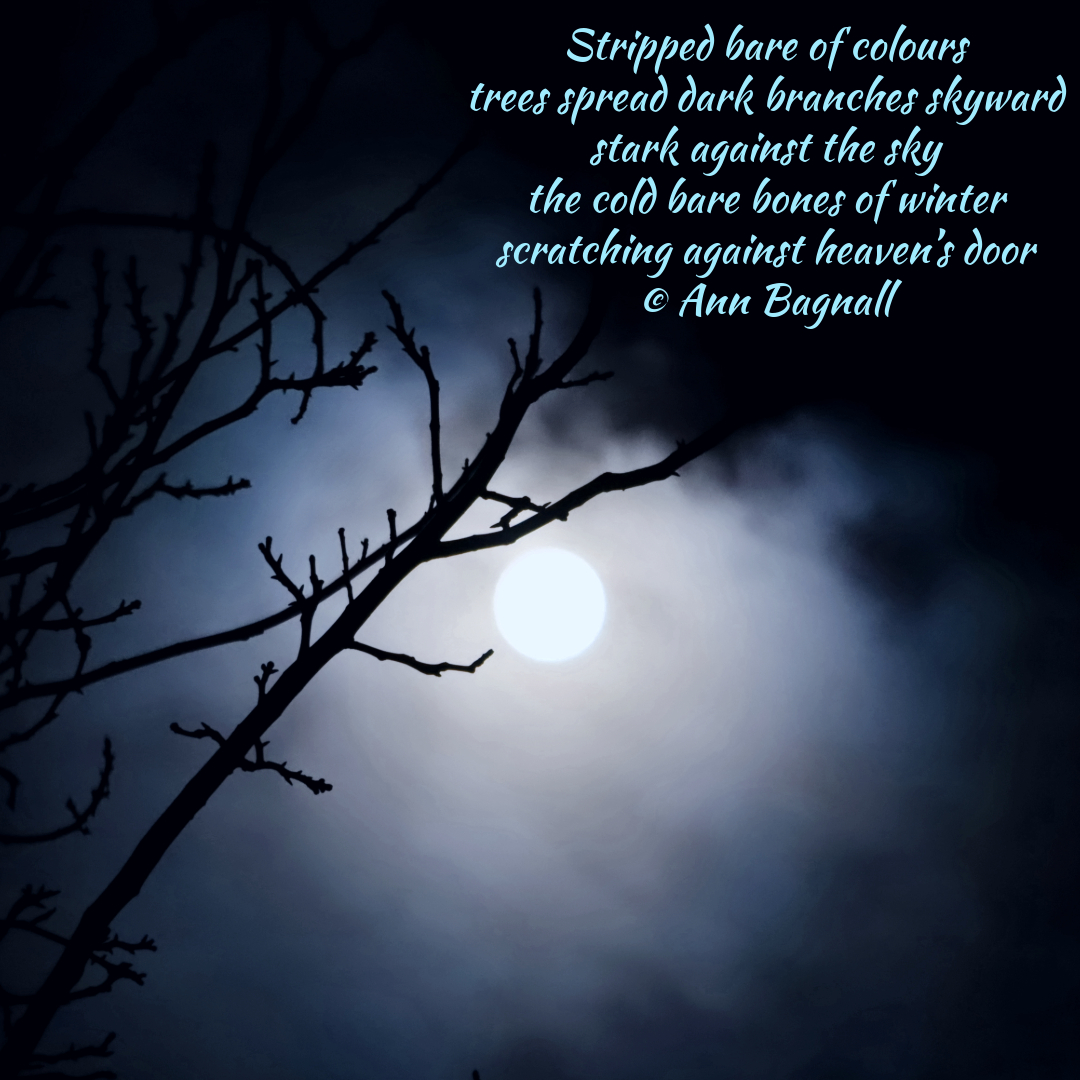 September 3, 2024August 30, 2024 Stripped bare of colours trees spread dark branches skyward stark against the sky the cold bare bones of winter scratching against heaven’s door © Ann Bagnall Share this: Click to email a link to a friend (Opens in new window) Email Tweet Click to print (Opens in new window) Print Like Loading... Related