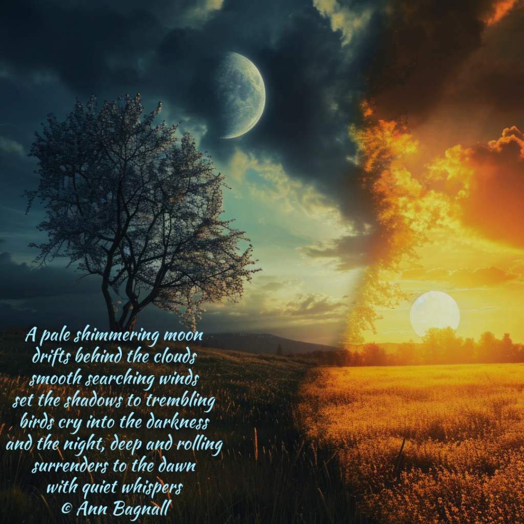 September 4, 2024August 30, 2024 A pale shimmering moon drifts behind the clouds smooth searching winds set the shadows to trembling birds cry into the darkness and the night, deep and rolling surrenders to the dawn with quiet whispers © Ann Bagnall Share this: Click to email a link to a friend (Opens in new window) Email Tweet Click to print (Opens in new window) Print Like Loading... Related