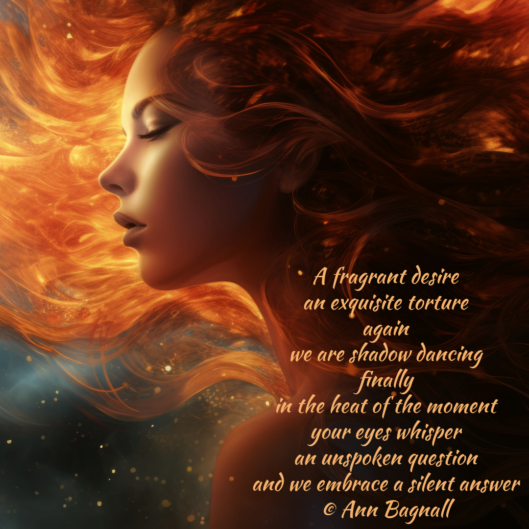 September 5, 2024August 30, 2024 A fragrant desire an exquisite torture again we are shadow dancing finally in the heat of the moment your eyes whisper an unspoken question and we embrace a silent answer © Ann Bagnall Share this: Click to email a link to a friend (Opens in new window) Email Tweet Click to print (Opens in new window) Print Like Loading... Related
