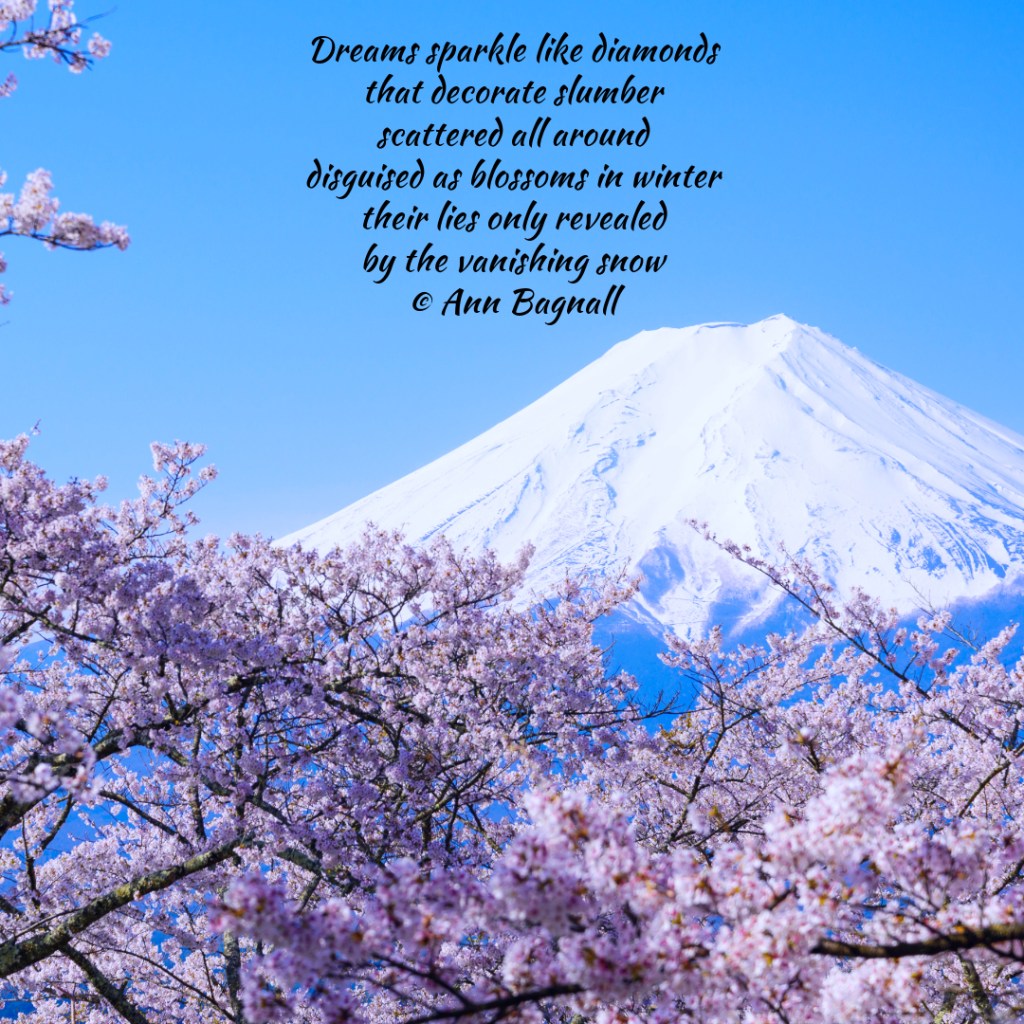 September 18, 2024September 9, 2024 Dreams sparkle like diamonds that decorate slumber scattered all around disguised as blossoms in winter their lies only revealed by the vanishing snow © Ann Bagnall Share this: Click to email a link to a friend (Opens in new window) Email Tweet Click to print (Opens in new window) Print Like Loading... Related