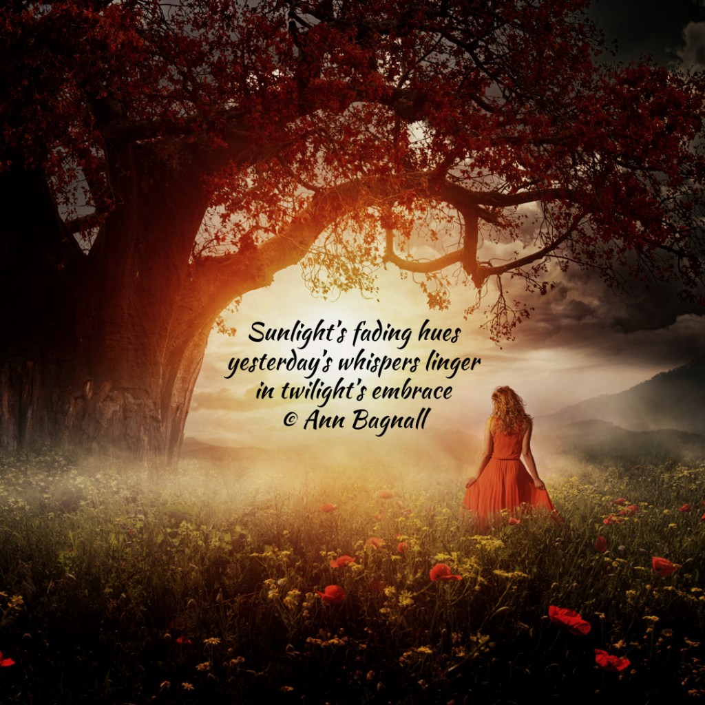 September 26, 2024September 9, 2024 Sunlight’s fading hues yesterday’s whispers linger in twilight’s embrace © Ann Bagnall Share this: Click to email a link to a friend (Opens in new window) Email Tweet Click to print (Opens in new window) Print Like Loading... Related