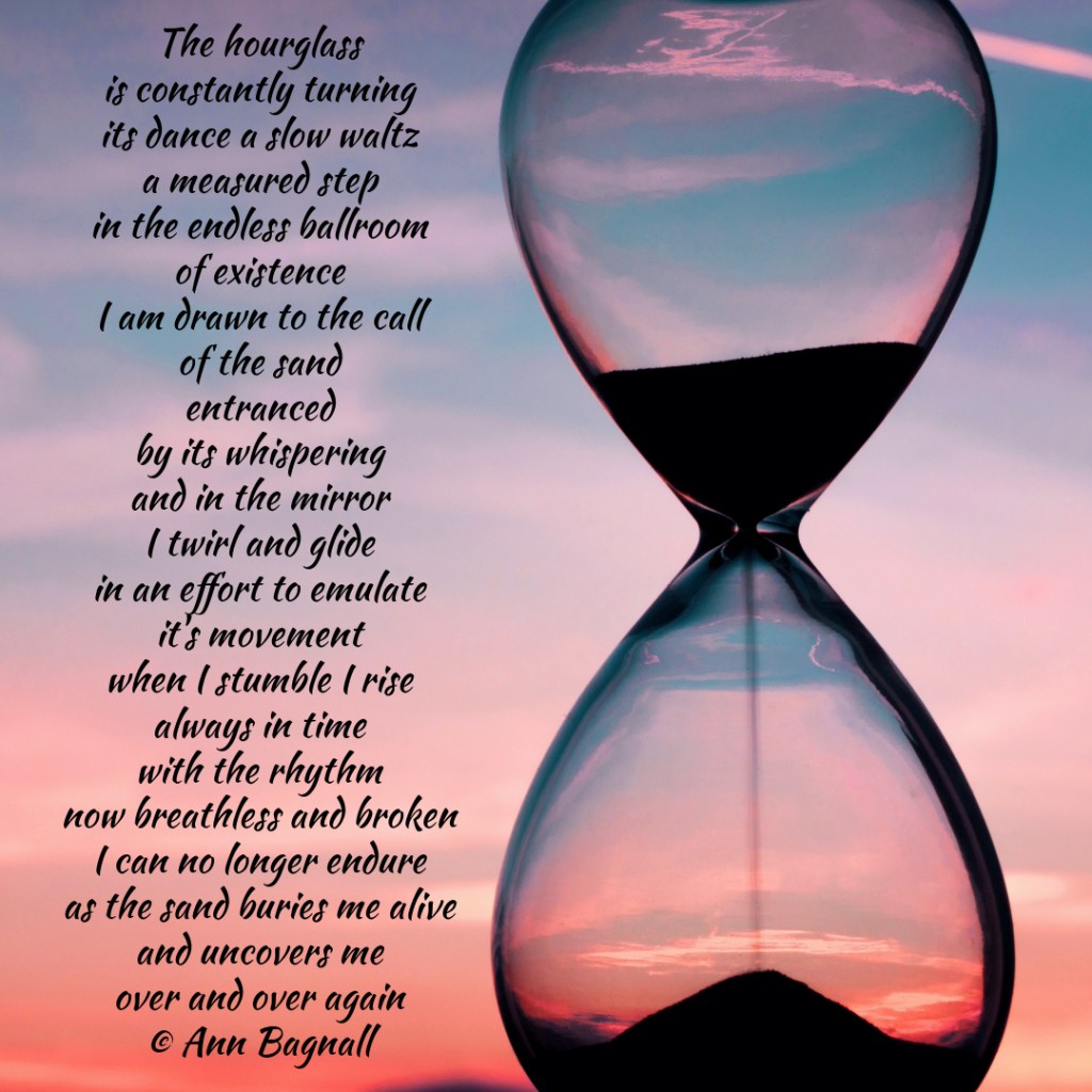 October 1, 2024October 1, 2024 The hourglass is constantly turning its dance a slow waltz a measured step in the endless ballroom of existence I am drawn to the call of the sand entranced by its whispering and in the mirror I twirl and glide in an effort to emulate it’s movement when I stumble I rise always in time with the rhythm now breathless and broken I can no longer endure as the sand buries me alive and uncovers me over and over again © Ann Bagnall Share this: Click to email a link to a friend (Opens in new window) Email Tweet Click to print (Opens in new window) Print Like Loading... Related
