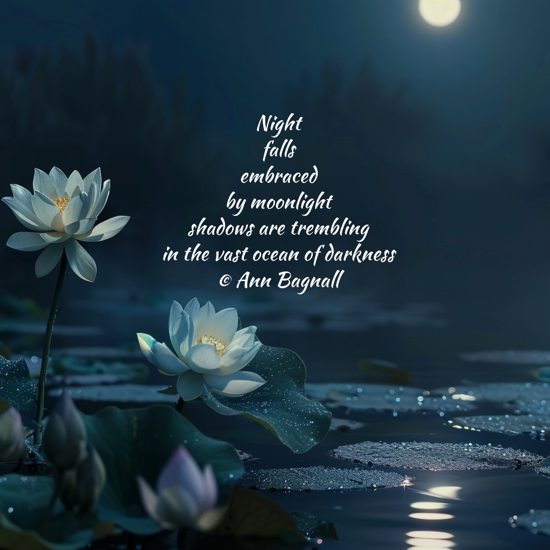 October 9, 2024October 6, 2024 Night falls embraced by moonlight shadows are trembling in the vast ocean of darkness © Ann Bagnall Share this: Email a link to a friend (Opens in new window) Email Tweet Print (Opens in new window) Print Like Loading... Related