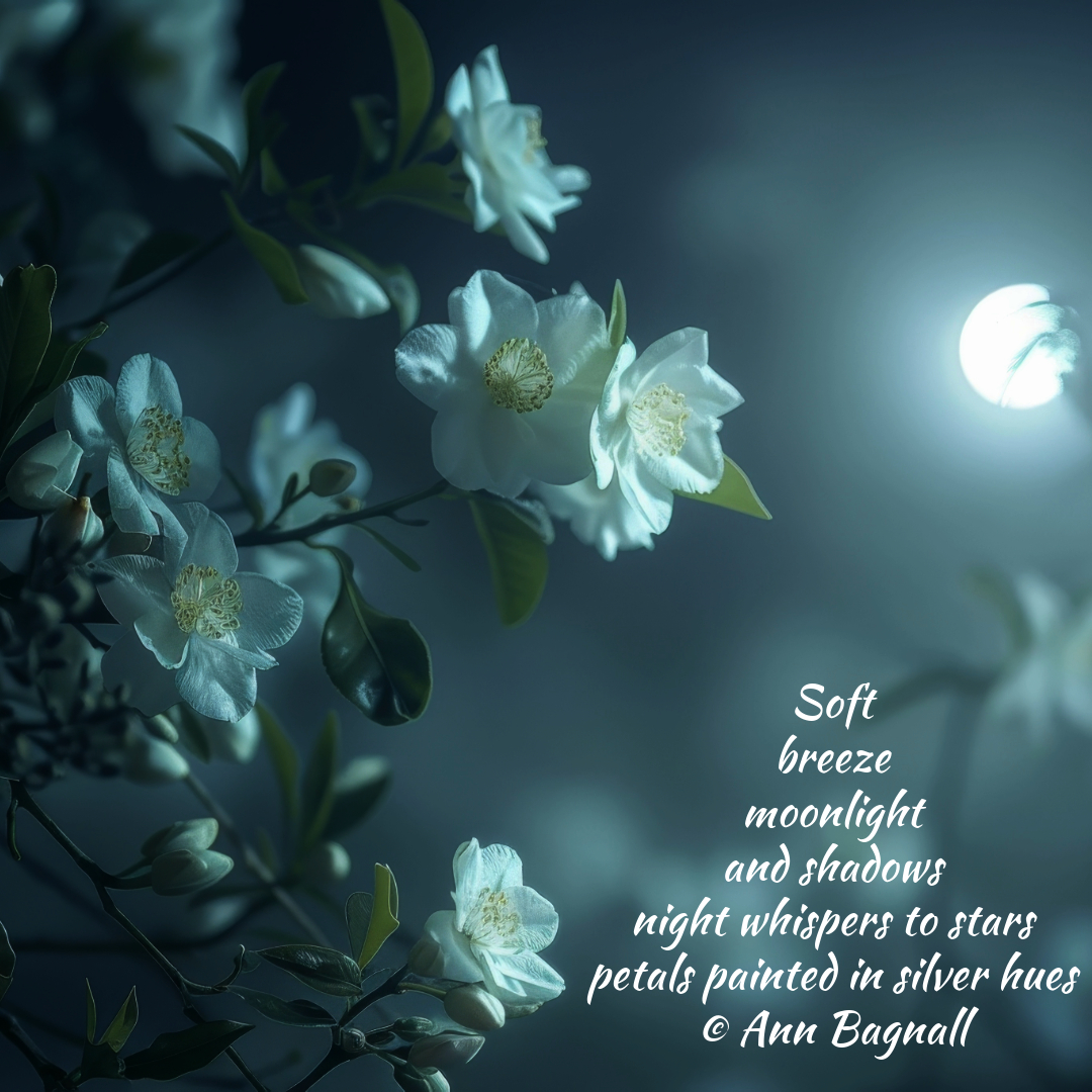 October 9, 2024October 6, 2024 Soft breeze moonlight and shadows night whispers to stars petals painted in silver hues © Ann Bagnall Share this: Click to email a link to a friend (Opens in new window) Email Tweet Click to print (Opens in new window) Print Like Loading... Related