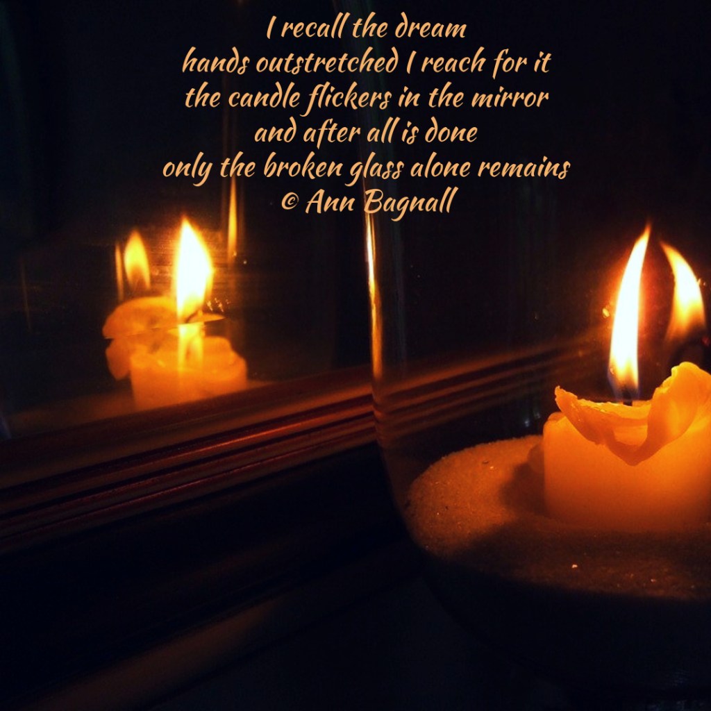 October 16, 2024October 6, 2024 I recall the dream hands outstretched I reach for it the candle flickers in the mirror and after all is done only the broken glass alone remains © Ann Bagnall Share this: Email a link to a friend (Opens in new window) Email Tweet Print (Opens in new window) Print Like Loading... Related