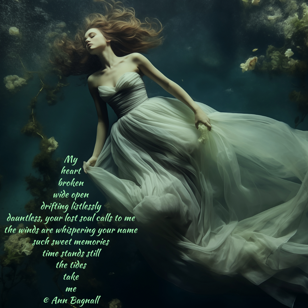 October 19, 2024October 19, 2024 My heart broken wide open drifting listlessly dauntless, your lost soul calls to me the winds are whispering your name such sweet memories time stands still the tides take me © Ann Bagnall Share this: Click to email a link to a friend (Opens in new window) Email Tweet Click to print (Opens in new window) Print Like Loading... Related